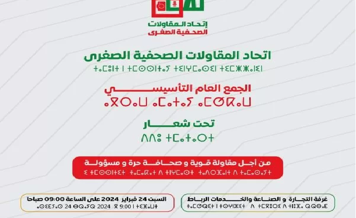 يعقد اتحاد المقاولات الصحفية الصغرى جمعه العام التأسيسي، صباح السبت 24 فبراير 2024 بمقر غرفة التجارة والصناعة والخدمات بالرباط ، تحت شعار: من أجــــل مقاولــــــة إعلاميـــة قويـــــة ومسؤولــــة.