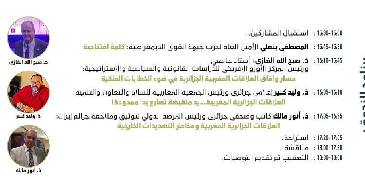 يعتزم حزب جبهة القوى الديمقراطية تنظيم ندوة في موضوع: “العلاقات المغربية الجزائرية في ضوء الخطب الملكية”، يوم السبت 14 يناير 2023، ابتداء من الساعة الثانية زولا (14:00)، بقاعة مركز الدراسات والبحوث الإنسانية والاجتماعية بوجدة، يؤطرها كل من أستاذ القانون الدستوري صبح الله الغازي من المغرب، والكاتبين والإعلاميين وليد كبير وأنور مالك من الجزائر الشقيقة.