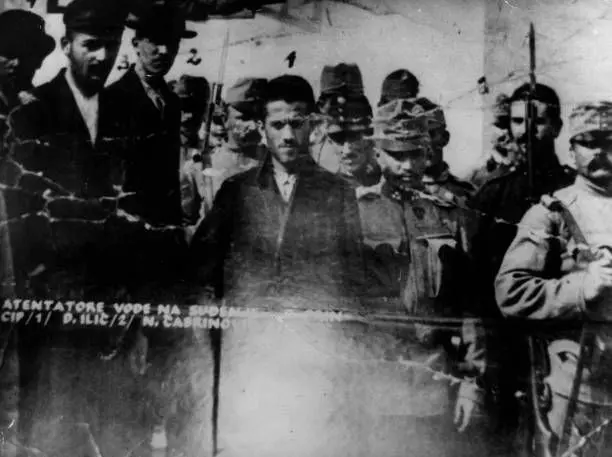 التعليق على الصورة،اقتياد الرجال المتهمين باغتيال الأرشيدوق فرانز فرديناند وزوجته إلى قاعة المحكمة وهم غافريلو برينسيب ودانيلو إيليتش ونيدجيلكو كابرينوفيتش